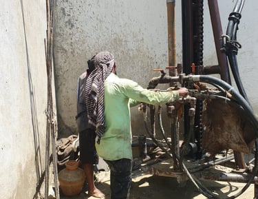 Powered drilling rigs used with high pressure compressor to drill in a 6½ inch diameter into the ground to access water from underground.